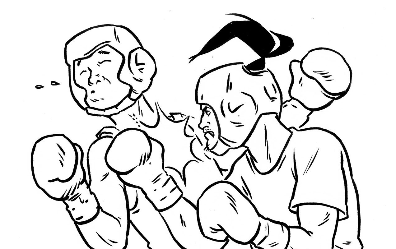 Dans la dernière case que je vous extraie de cette histoire, Corben fait aussi quelque chose “que l’on ne fait pas”. En Bd on évite de dessiner l’impact de façon arrêtée, on préfère dessiner le résultat de l’impact. Comme dans ce dessin de boxe. L’impact c’est l’étoile, mais on montre la force du coup par le recul du visage du boxeur qui a reçu l’uppercut.